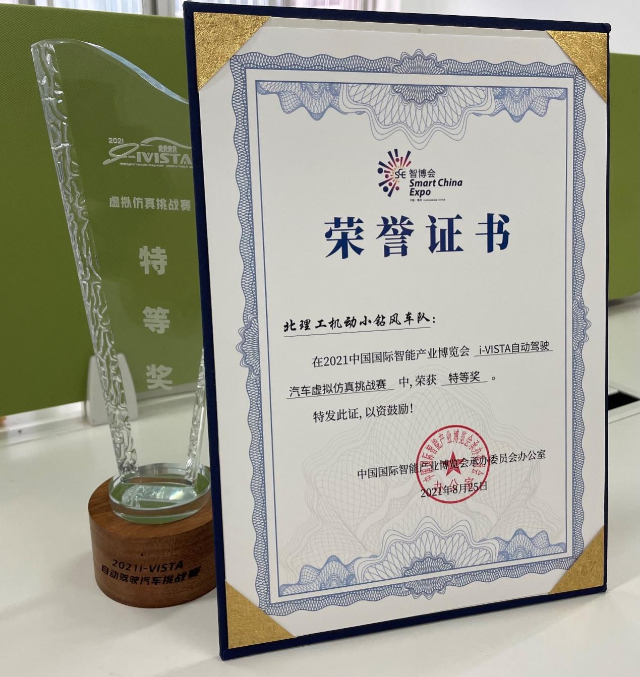 8月19日至22日,由中国国际智能产业博览会组委会主办的第四届2021 i-VISTA自动驾驶汽车挑战赛在重庆两江新区举行。由何洪文教授指导的刘文婕、贾淳淳、张奎组成的机动小钻风车队参加了虚拟仿真挑战赛,以决赛第一名的成绩荣获2021 i-VISTA自动驾驶汽车挑战赛虚拟仿真挑战赛特等奖。