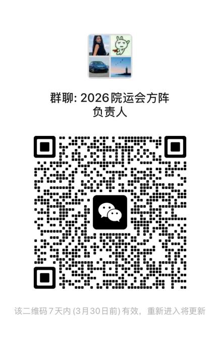 7.方阵组队研究生以研究所为单位,本科生以专业为单位进行组队,参与人员需为教师、学生共同参与,其中方阵引导人需为教师,请各研究所、专业指定1人为方阵负责人并扫描下方二维码进入“2026年学院运动会方阵负责人群”(建议方阵负责人与赛事负责人不兼任)。方阵表现与精神文明奖评比挂钩。